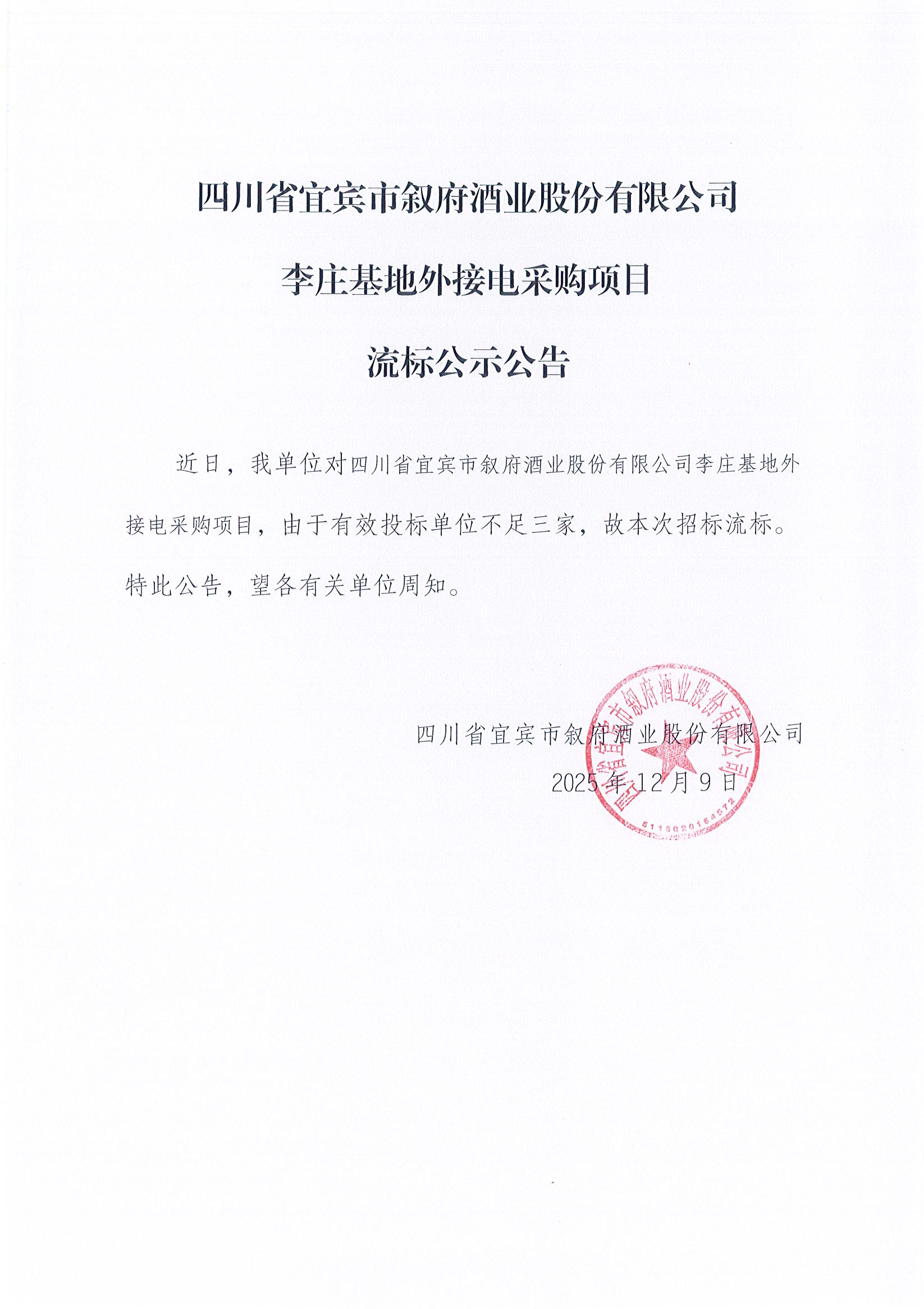 四川省宜賓市敘府酒業(yè)股份有限公司李莊廠區(qū)2025-2026年度丟糟出售項目競價結(jié)果公示公告