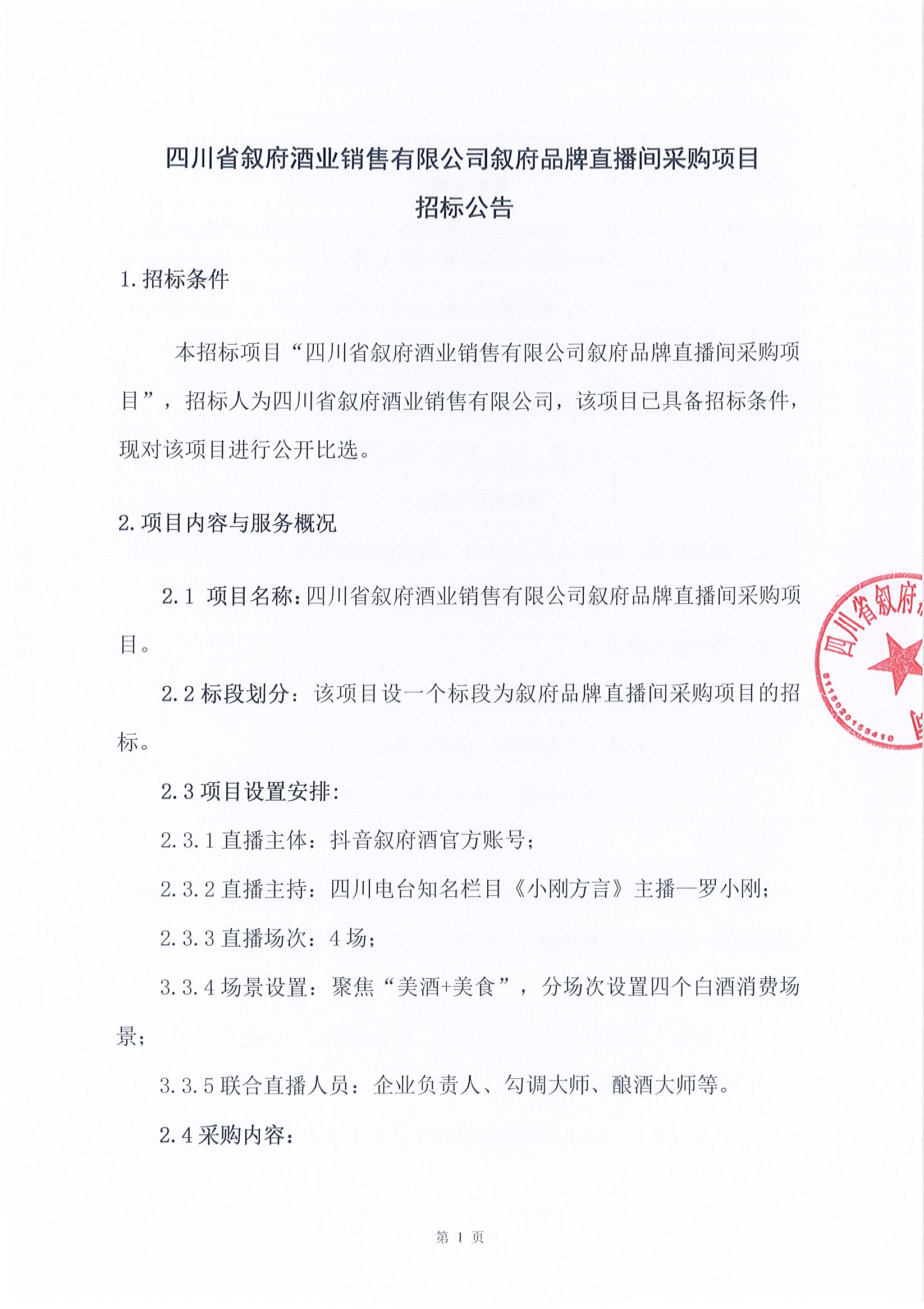 四川省敘府酒業(yè)銷售有限公司敘府品牌直播間采購項目招標公告
