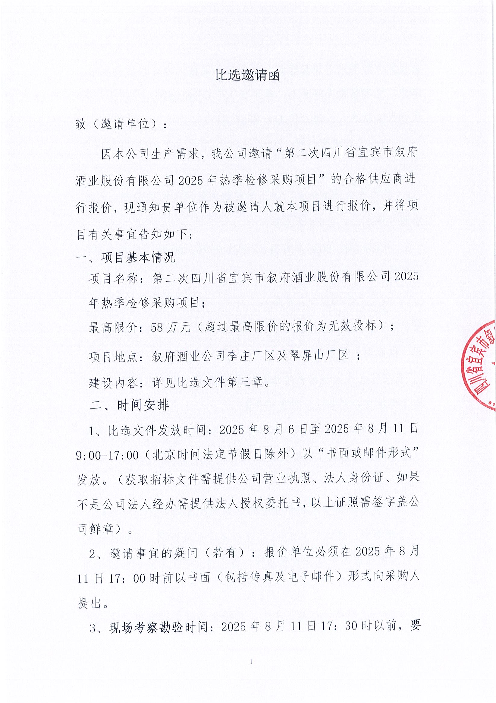 四川省宜賓市敘府酒業(yè)股份有限公司2025年熱季檢修項目公開比選招標(biāo)公告