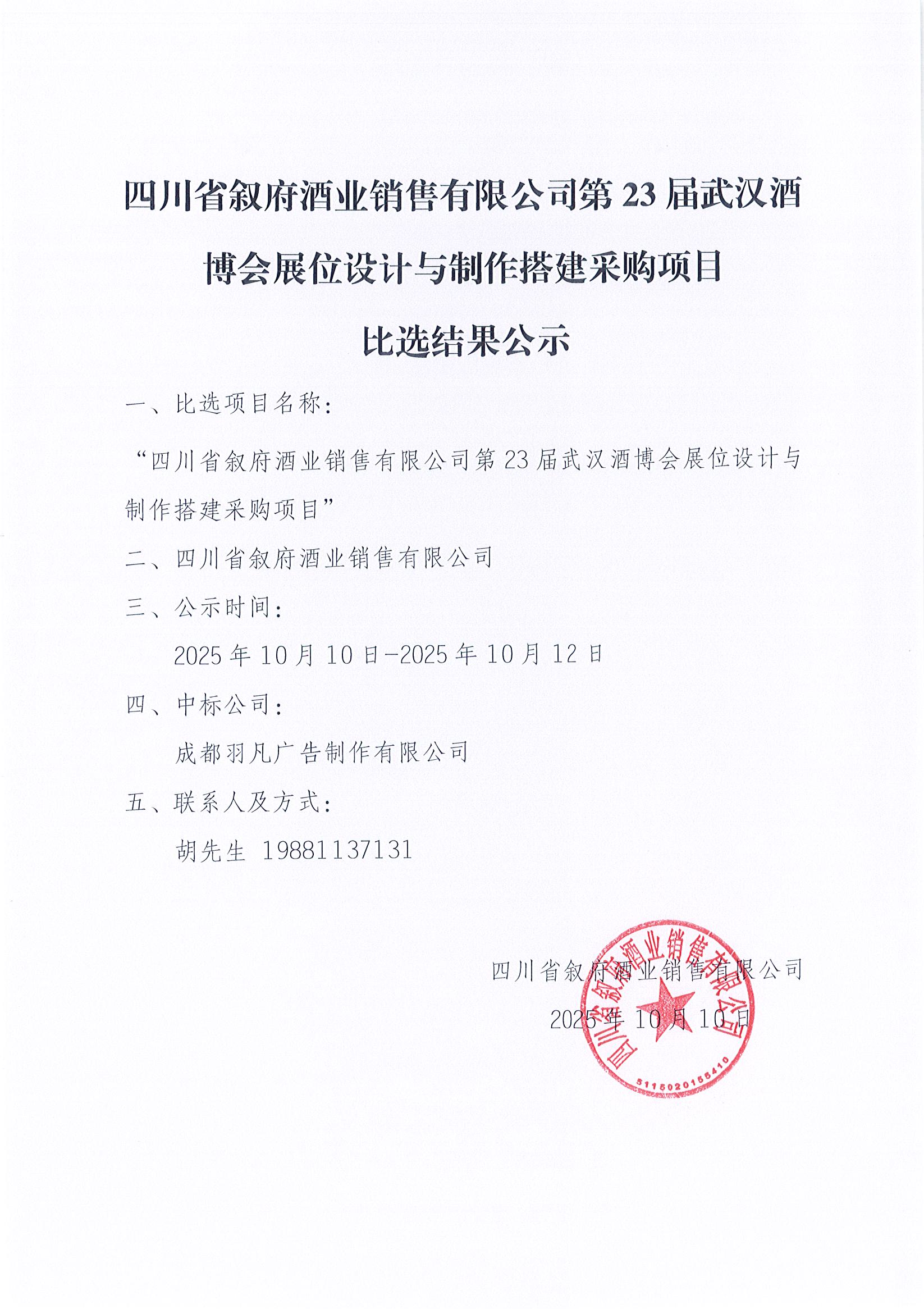 四川省敘府酒業(yè)銷售有限公司敘府大曲(藍標)產品TVC的創(chuàng)作與拍攝采購項目中標結果公示公告
